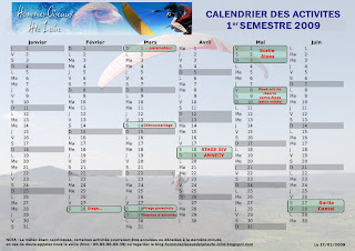 Voici en avant première le calendrier des activités du club pour le premier semestre 2009. On enverra à tous le monde un bulletin donnant les infos pour chaque sortie et activité. On continue à travailler sur les ouvertures de sites, on vous tiendra au courant rapidement. Ce calendrier sera mis à jour en fonction de la météo ou s’il y a d’autres propositions.